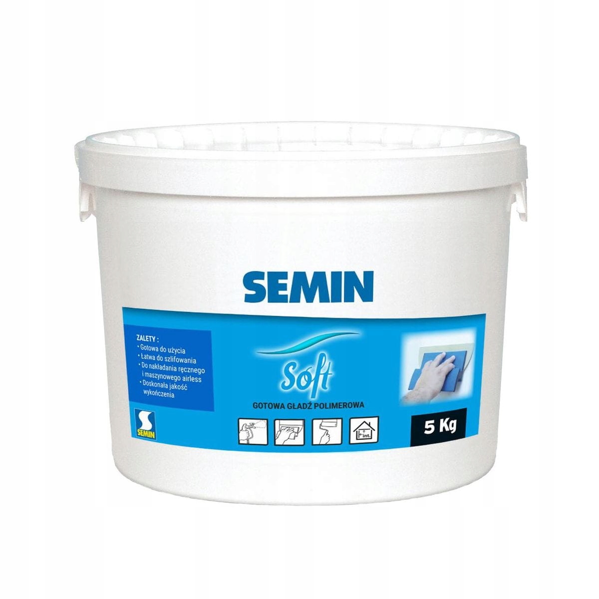 Gotowa gładź polimerowa 5 kg Semin Soft gotowa do użycia wewnątrz budynku. Do nakładania ręcznego, wałkiem oraz maszynowo. Rewolucja w recepturze Semin! Przy zachowaniu wysokiej jakości produktu, obniżyliśmy finalną twardość gładzi Semin Soft. Dzięki temu produkt jest łatwiejszy do wyszlifowania. Główne zalety: łatwa do wygładzenia oraz szlifowania (szlifowanie papierem o gradacji 220), jednorazowa aplikacja do 3mm, aplikacja ręczna, wałkiem, mechanicznie – zawartość polimerów zwiększa przyczepność do podłoża, gotowa do użycia, możliwe rozcieńczenie do 1%.