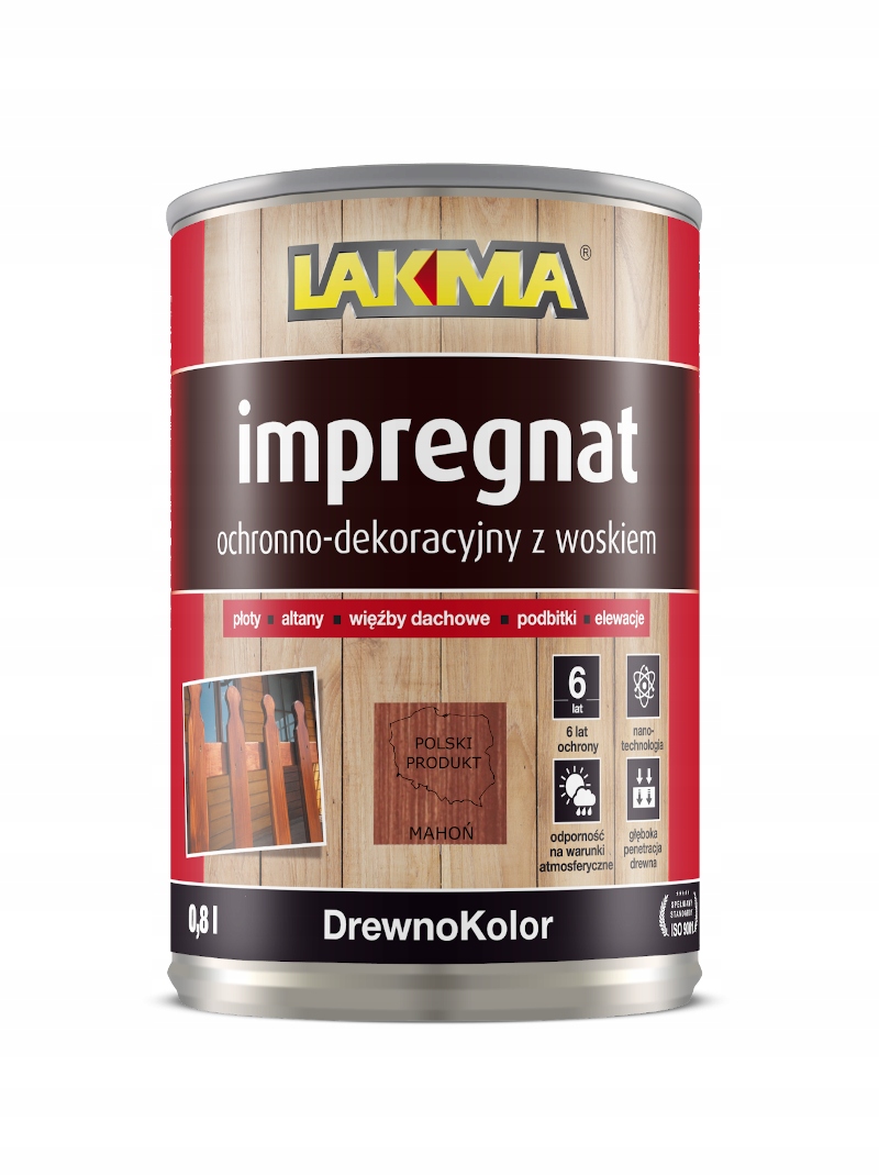 Impregnat ochronno – dekoracyjny z woskiem marki LAKMA charakteryzuje się głęboką penetracją surowego drewna, zapewniając jego długotrwałą ochronę i dekorację. Dzięki zastosowaniu technologii NANO CODE, wysokiej jakości pigmentów nieorganicznych oraz wodoodpornego wosku, impregnat zabezpiecza drewno i materiały drewnopochodne przed wilgocią i działaniem czynników atmosferycznych, w tym promieniowaniem UV. Zawarte w impregnacie nanocząsteczki wnikają głęboko w strukturę drewna, tworząc bardzo szczelną i trwałą powłokę, która znacznie wydłuża żywotność impregnowanych elementów. Powłoka impregnatu odporna jest na zasiedlanie pleśniami grzybami.