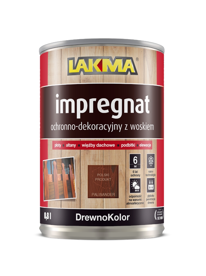 Impregnat ochronno – dekoracyjny z woskiem marki LAKMA charakteryzuje się głęboką penetracją surowego drewna, zapewniając jego długotrwałą ochronę i dekorację. Dzięki zastosowaniu technologii NANO CODE, wysokiej jakości pigmentów nieorganicznych oraz wodoodpornego wosku, impregnat zabezpiecza drewno i materiały drewnopochodne przed wilgocią i działaniem czynników atmosferycznych, w tym promieniowaniem UV. Zawarte w impregnacie nanocząsteczki wnikają głęboko w strukturę drewna, tworząc bardzo szczelną i trwałą powłokę, która znacznie wydłuża żywotność impregnowanych elementów. Powłoka impregnatu odporna jest na zasiedlanie pleśniami grzybami.