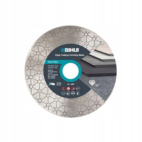 Tarcza diamentowa Bihui o średnicy 125 mm z otworem centrującym 22,23 mm, przeznaczona do cięcia pod kątem 45, szlifowania na sucho wszelkiego rodzaju materiałów ceramicznych i gresu. Możliwość ukosowania na mokro na przecinarkach do płytek.
